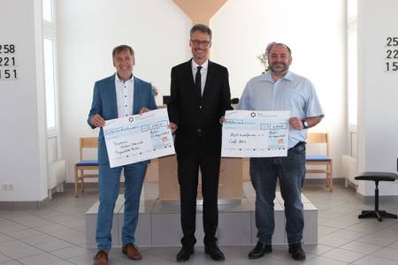 Nach dem Gottesdienst begrüßte Dr. Hirsch den Geschäftsführer der Diakonie Neckar-Odenwald, Guido Zilling für die Tagesstätte Buchen sowie Karol Piotrowski, Leiter des Tageszentrums für seelische Gesundheit der AWO Unterfranken in Miltenberg. Beide Einrichtungen erhielten eine Zuwendung aus dem diesjährigen Jahresförderschwerpunkt „Hilfe für psychisch erkrankte Menschen“ von human aktiv, dem Hilfswerk der Neuapostolischen Kirche Süddeutschland.